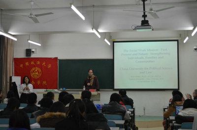 做了相关的介绍,Marks院长俊朗的外表,清新的谈吐,以及翩翩的风度立刻吸引了同学们的目光。结束介绍,Marks院长就社会工作展开自己的演讲。Marks院长先介绍了社会工作的使命,即从物质以及精神层面给予个人或某以群体以帮助,促进社会和谐人民和乐。然后,Marks院长介绍了美国社会工作的发展过程,说明了美国社会工作由偏重对受众的外在支持到偏重心理支持,再到转为社会支持、家庭支持以及个人心理调节的两次转变。接着,Marks院长又就贫困问题的起因以及美国相关的解决措施做出了分析,并且举出了“安置之家”和“慈善组织会”两个例子来具体说明美国解决贫困问题的措施。结束了关于贫困的论述,Marks院长又对自己在社会工作实践中遇到的问题作了较为深入的探讨,因此开展社会工作是要注意将社会支持、家庭支持以及心理调节相结合,并指出社会工作未来将向这一方向发展。听完Marks院长的精彩演讲,同学们脸上浮现出赞叹的神情。