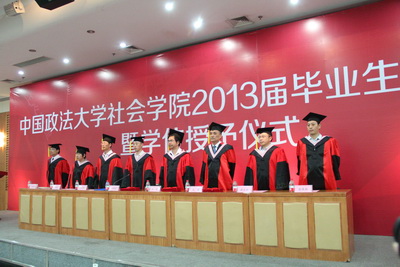 优秀毕业生张樹沁代表全体13届本科毕业生上台发言,他自言好比风筝,飞向天空,但线依旧牵挂着放飞的地方,感谢学院老师们四年来对同学们的教育、关心和帮助,同时感谢军都山下、法大路上同窗的携手互助、相伴而行。作为一名毕业生,他衷心的祝福母校,祝福社院,衷心的祝愿每一位毕业生们都能够在未来的道路上一切顺利。优秀毕业生李婕代表研究生毕业生发言,她指出三年前来到政法的校园,一开始对环境些许失望,但是后来理解老师们的优秀,逐渐对法大产生留恋。三年的研究生生活,他们进行重新的自我定位,感谢老师,感谢父母,不想伤离别,只想坚定包容如拓荒牛一般手在犁上,自当努力向前。