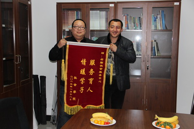 送上了印有“服务育人,情暖学子”的锦旗,真挚地感谢饮食服务中心对学院的困难学生的关心和资助。