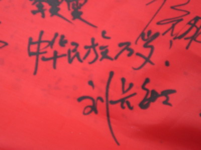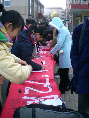 分团委书记邢小兰老师、金刚玉老师,还有很多教师和外教,甚至学活管理员和学校保安等许多教职员工都参与了签名活动。短短的一个半小时的时间,大家饱含激情的话语就写满了14米的条幅,很多地方文字甚至相互覆盖了几层。
