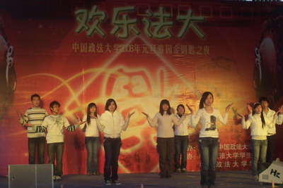 12月31日,07年的最后一天,法大热闹非凡、洋溢着节日的喜悦。学校和各个学院以各种不同的形式庆祝08年的到来。晚上6:00,启运体育馆里举办一年一度规模盛大的元旦游园活动,中央舞台演出区上演着精彩纷呈的歌舞、相声等节目,各个学院也将自己精心设计的游戏以不同的形式展现出来。