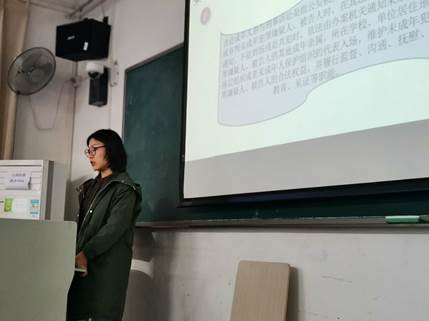 第一组汇报同学为苑樱宝与张路路同学,实习地点为扬州市珍艾社会工作事务所。在实习汇报中,苑樱宝和张路路同学把在扬州实习的内容分为三个部分进行汇报。首先是苑樱宝同学对实习机构概况以及在实习期间接触的项目和相关工作内容的介绍。其中主要包括:参与项目、外出活动、开展个案访谈以及参与相关工作会议。参与项目涉及“为爱护航”不良行为未成年人矫治;青少年禁毒宣传教育“双百计划”;农村留守儿童关爱保护;社会性别视角下的女性罪犯矫正方法等。外出活动包括妇联培训、夏令营活动以及社区探访。接下来,张路路同学对实习期间参与的个案活动进行了介绍,个案主要来自于法院委托、强制戒毒和未检观护三大方面,并分享了在个案过程中所汲取的经验。最后,张路路同学对二人的实习经历进行总结,提出了在实习过程中遇到的诸如克服个人心理障碍以及个案过程多因素干扰等方面的问题。同时,二人希望在今后的学习中要注重对实务工作的理解和学习,加强对理论的学习与思考,并且进一步学会处理理论与现实之间的矛盾和差异。