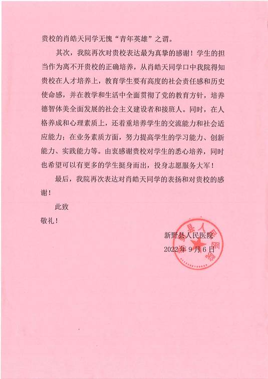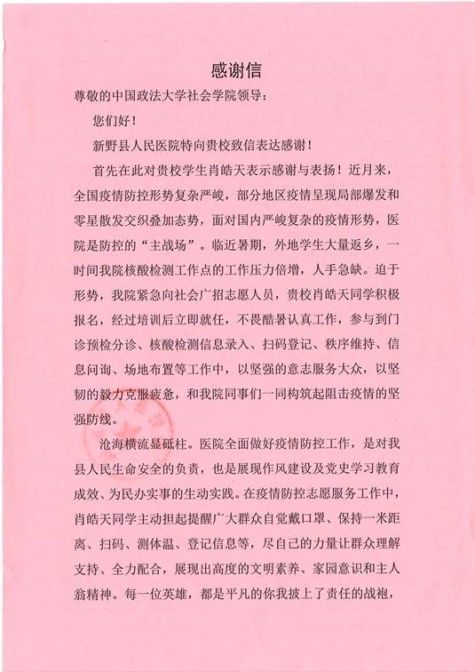 近日,禁漫 收到新野县人民医院对社会工作2101班肖皓天同学的表扬信,表扬他在新野县人民医院疫情防控志愿工作中的突出表现。