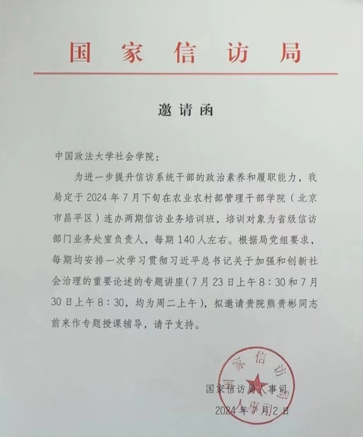 国家信访局于2024年7月下旬在农业农村部管理干部学院连办两期信访业务培训班,培训对象为省级信访部门业务处室负责人,每期140人左右,旨在进一步提升信访系统干部的政治素养和履职能力。