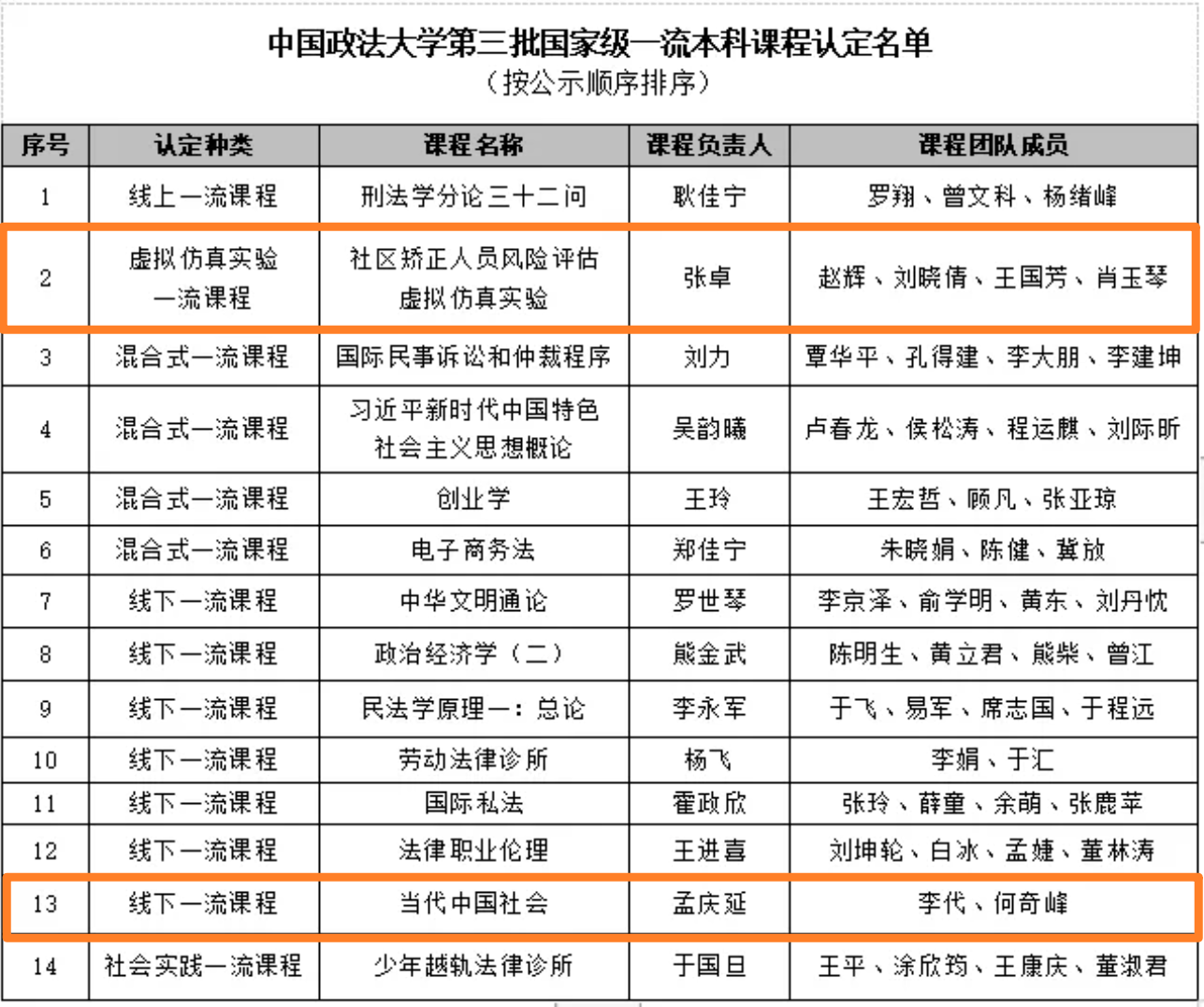 张卓教授团队的《社区矫正人员风险评估虚拟仿真实验》与孟庆延教授团队的《当代中国社会》两门课程成功入选,分别被认定为“国家级虚拟仿真实验教学一流课程”和“国家级线下一流课程”。