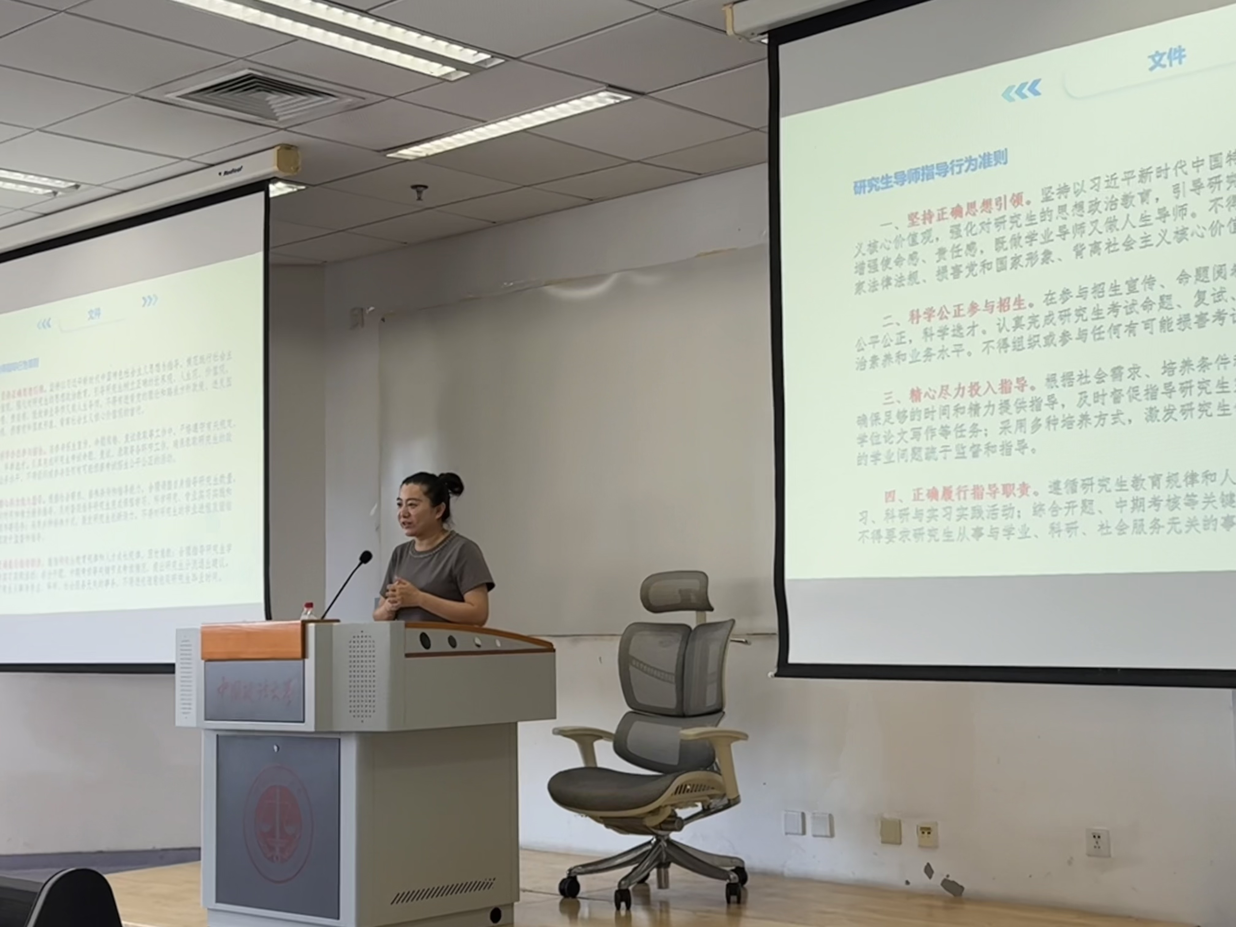 党委副书记兼纪委书记刘晓倩以“师德师风建设与研究生行为规范”为主题开展专题培训,带领师生共同学习教育部2020年印发的《研究生导师指导行为准则》,从“坚持正确思想引领”“科学公正参与招生”“精心尽力投入指导”“正确履行指导职责”“严格遵守学术规范”等8个维度,明确导师在思想引导、学术指导、人文关怀等方面的职责。同时,刘晓倩老师特别提醒新生,要主动与导师保持定期沟通,形成良性师生互动。接着,她结合《普通高等学校学生管理规定》《学生离校请假管理办法》等文件,强调“学习和研究是研究生阶段的第一要义”,要求新生重视课程学习与学分修读,严格遵守规章制度。