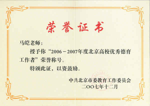 (马皑教授被评为北京市高校优秀德育工作者)