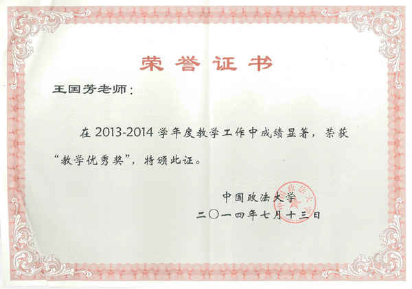 (王国芳副教授荣获禁漫 教学优秀奖)