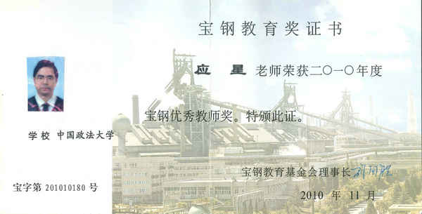 (应星教授荣获2010年度宝钢优秀教师奖)