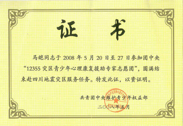 (马皑教授参加团中央“12355灾区青少年心理康复援助专家志愿团”)