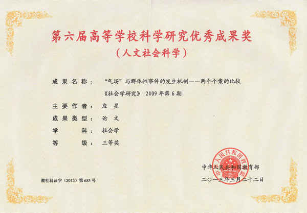 (应星教授荣获教育部第六届高校科学研究优秀成果三等奖)