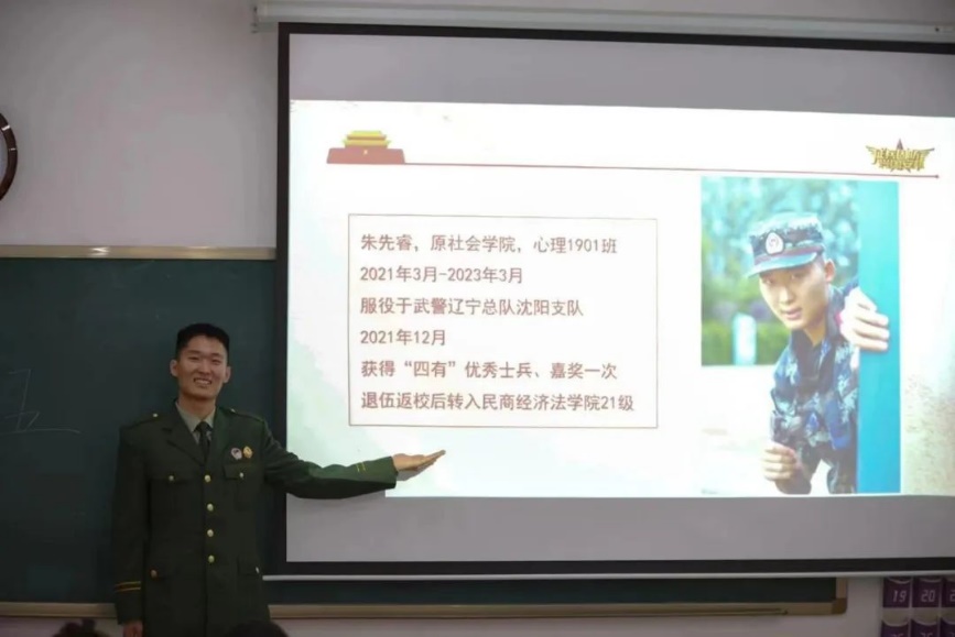 “卫国从军志不变,英姿飒爽做兵雄。”李婧师姐用“内敛”“血性”“坚韧”三个关键词总结了自己两年艰苦的军旅生活。初入新兵连,“少说话多做事”的口号烙印心中,既能服从命令又能高效解决问题才是智慧;进行团队任务时,“见红旗就抗,见第一就争”的教导萦绕耳畔,挑得起担子才是担当;艰苦训练中,“大腿带小腿,左腿带右腿”的感受无比深刻,哭过之后的全力奔跑才是成长。李婧师姐感慨道,回望过去,军旅经历诚如勋章;放眼未来,大好未来尚待展卷。师姐的宣讲让同学们深切感受到了“四有”优秀士兵称号的来之不易,深入了解到了军旅生活的苦与累、血与汗,深刻意识到了军人的不易与神圣,也深深审视了自己的参军意愿和参军动机。