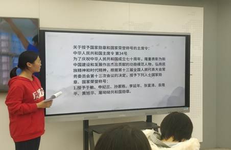 随后,主持人对八位共和国勋章获得者:“两弹一星”于敏、“争取男女同工同酬急先锋”申纪兰、“两弹一星”孙家栋、“一级英雄”李延年、“战斗英雄”张富清、“杂交水稻之父”袁隆平、“核潜艇设计者”黄旭华和“诺贝尔医学奖获得者”屠呦呦的事迹分别进行了简要介绍,并且带领同学们深入学习了申纪兰关于争取男女同工同酬所做出的长期努力和袁隆平不断改良杂交水稻、不断突破粮食亩产的先进事迹。