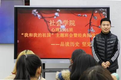 心理1901班积极落实团中央、学校和学院的统一安排部署,于11月14号开展了“我和我的祖国”主题班会和“品读历史,坚定信仰”经典阅读活动。班主任谢中垚、辅导员唐铭泽以及心理1901班全体学生参加活动,活动由团支书刘建硕主持。