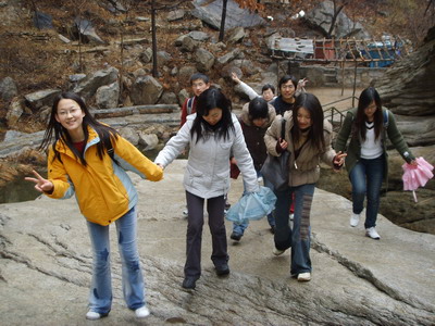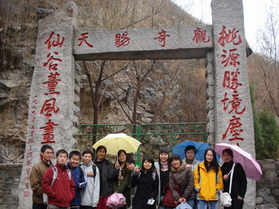 在农家院休息了一晚,体验过充满北方特色的大院生活后,同学们都从旅途的劳顿中恢复过来。第二天一大早,大家就背上行囊来到桃源仙谷,开始了惊险刺激的登山活动。虽然已经是阳春三月,但山谷里的气温却很低,再加上昨晚下了一场雪,山路更是难行。山上的桃花只零星开了两三朵,小溪里的流水都还结着冰,大家只能感叹与桃园春景无缘。但是,仙谷胜境却展现给大家另一派奇特的景象——冰瀑布。感叹之余,大家争先恐后的拍照留念。