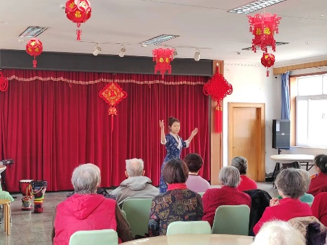 上午九点半,一众志愿者到达爱地老人颐养中心,老人们已早早落座等候大家。随后,10名陪伴志愿者纷纷走到老人身旁,与老人们亲切交谈。20名艺体志愿者在旁边候场,准备着自己的节目。接着,主持人朗读开场白,向老人们传达最真挚的问候与祝福,同时宣布演出开始。