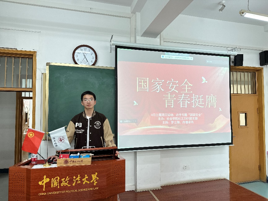 4月12日下午,社会工作2301班团支部于昌平校区端升楼405教室召开“国家安全 青春挺膺”主题团日活动,团支部全体学生参加,团支部书记罗士翔主持。