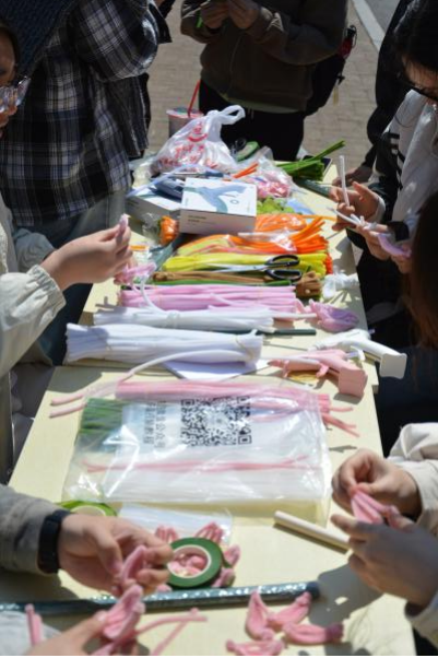 在工作人员的引导和帮助下,参与者将白色扭棒拗成玉兰的雪白花瓣、将粉色绒线编作美丽的海棠;每个人都用专注的目光和灵巧的双手编织着属于自己的那支花。在两个多小时的时间里,一件件独一无二的花艺作品在同学们年轻的掌纹间绽放。