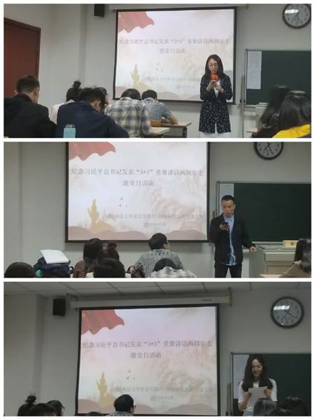 17-18级研究生联合党支部在学院路校区新B114教室举办了纪念习近平总书记发表“5•3”重要讲话两周年主题党日活动。出席本次活动的有支部全体党员、发展对象及部分入党积极分子,会议由党支部书记周春婷同志主持。在热烈的分组讨论后,与会成员纷纷结合社会热点问题及亲身经历,发表了自己的真实感受和心得体会。