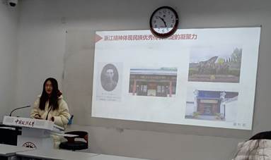积极分子陈嘉晔向同志们讲述了“浙江精神与文化自信”的相关内容。文化自信具有三种特征,体现人民团结奋斗迸发的生命力、体现民族优秀传统积淀的凝聚力、体现时代变革创新蕴育的创造力。浙江精神可以充分地体现文化自信的三种特征,习近平总书记指出:“浙江能够较好地适应市场经济的文化传统,在于浙江人‘自强不息、坚韧不拔、勇于创新、讲求实效’的人文精神。” 浙江所具有的深厚文化底蕴,在浙江精神蕴含的文化自信力量的推动下,促进人的全面发展和社会的全面进步。