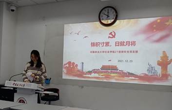 21级研究生党支部在2021年12月23日上午10时许,于海淀校区教学图书综合楼0407教室组织开展“铢积寸累,日就月将”主题活动。该活动由党支部书记周涵主持,支部党员和积极分子参与学习与讨论。本次活动共包括三个部分,首先周涵同志带领大家学习了十九届六中全会精神决议的内容以及马克思主义中国化的理论知识,随后三名积极分子分享了研读党史经典的心得体会,最后所有党员和积极分子进行集体讨论,充分表达了自己的观点和收获。党支书周涵进行总结并向大家阐述填写积极分子材料的注意事项。