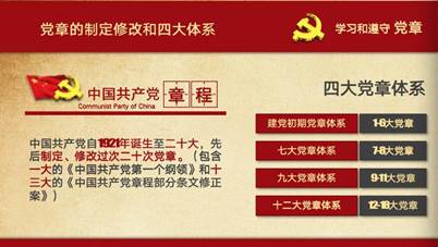 党章发展的历史就是一部浓缩的党史,中国共产党自1921年诞生至二十大,先后制定、修改过次20次党章(包含一大的《中国共产党第一个纲领》和十三大的《中国共产党章程部分条文修正案》),伴随着不断修改,党章也形成了分别以一至六大党章、七至八大党章、九至十一大党章、十二至十八大党章为基础的四大体系。最新的《中国共产党章程(修正案)》于2022年10月22日经中国共产党第二十次全国代表大会通过生效,本次修正案共有50处修改,涵盖6个方面:第一,充实完善习近平新时代中国特色社会主义思想的科学内涵和历史定位;第二,把“两个结合”这一马克思主义中国化时代化的规律性认识写入党章;第三,把党百年奋斗的重大成就和历史经验写入党章;第四,对关于社会主义初级阶段的相关内容进行了调整和充实;第五,增写了坚持和加强党的全面领导的有关内容;第六,吸收党的十九大以来全面从严治党的宝贵经验,对党的建设相关内容进行了调整充实。