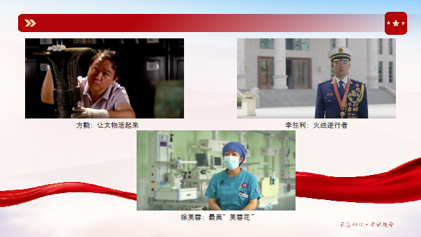 第二部分,支部同志共同观看二十大代表方勤、李胜利、徐芙蓉的光荣事迹。