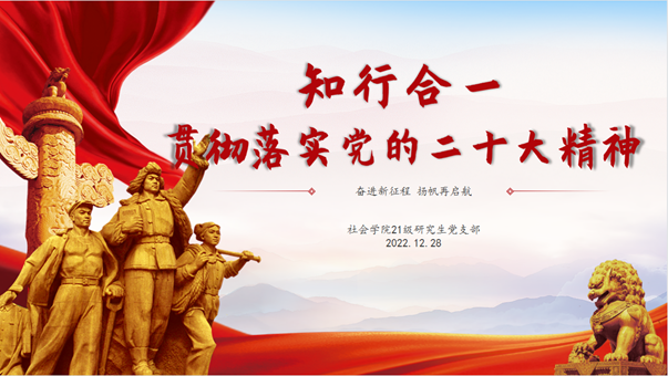 2021级研究生党支部通过线上会议的方式举行了“知行合一贯彻党的二十大精神”主题党日活动。在党支部书记周涵的主持下,本次会议主要包含以下三个流程:首先,由党支部书记周涵带领所有参会的同志深入学习党的二十大精神;其次,大家共同观看方勤、李胜利和徐芙蓉三位二十大代表的事迹短片;最后,党支部书记周涵进行简单总结并明确心得体会相关要求。